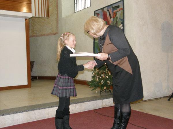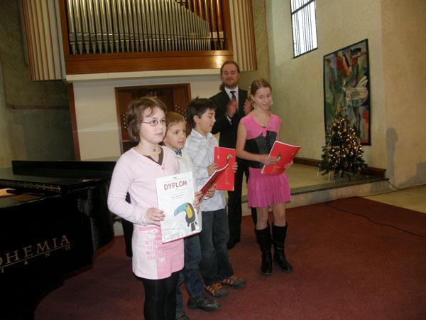 Jako již každoročně se první pátek v prosinci konalo slavnostní předávání cen, které získali žáci Výtvarného oboru ZUŠ v mezinárodních soutěžích. Setkání se uskutečnilo v koncertní síni Trojice v Písku. Diplomy z Číny, Polska, Japonska a Maďarska předávali vzácní hosté: Mgr. Jiří Zimola – hejtman Jihočeského kraje, JUDr. Ondřej Veselý – starosta města Písku, PaedDr. Jiřina Tichá – ředitelka odboru všeobecného vzdělávání MŠMT ČR, Zdeněk Troška – režisér, Ing. Petr Špirhanzl – vrchní ředitel sekce financování a správní MŠMT ČR, Mgr. Vlasta Bohdalová – poslankyně Parlamentu ČR za Jihočeský kraj. V úvodním projevu poděkovala paní ředitelka Jindřiška Kudrlová hejtmanovi Jihočeského kraje, panu starostovi a představitelům ministerstva školství za podporu Základních uměleckých škol, které přinášejí možnosti rozvoje dětským talentům ve všech uměleckých oborech. Poté přednesli hosté krátké projevy a následovalo koncertní vystoupení žáků ZUŠ. V závěru byly předány žákům diplomy a medaile a děti se mohly s hosty a učitelkami vyfotografovat.